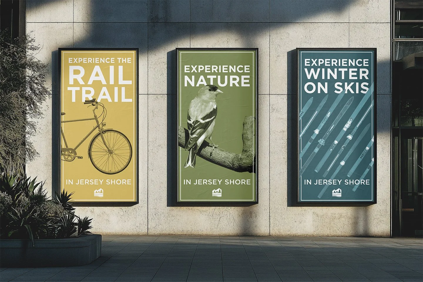 For this project, I created a cohesive visual identity for Jersey Shore, PA centered around its outdoor spaces and environmental charm. The logo, trail signage, street banners, and map work together to encourage exploration and highlight the town’s connection to nature.